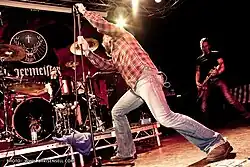 Stylistically, Earthtone9 combines a wide variety of influences from rock, metal, noise and hardcore.[12] Characteristic are the constant mood changes within individual songs and albums.[13][14] Often, heaviness and oppressive moments are combined with harmony and melody. A large number of critics attested to earthtone9's creativity and innovative spirit.[12][15][16] The band is sometimes attributed cult status.[17][18][19] Guitarist Joe Roberts named bands such as Alice in Chains, Carcass, Faith No More, Helmet, Metallica, Monster Magnet and The Police among his influences.[20]