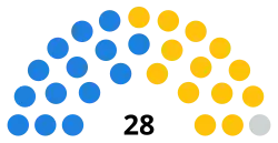Since the last full review of boundaries in 2019 the council has comprised 28 councillors, representing 14 wards. Elections are held every four years.[21]