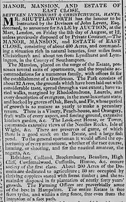 When he died in 1807 he was buried in the Priory Church in Christchurch. Mary Hawkes became the proprietor of East Close[28] and lived there as a recluse. A newspaper article stated that she "was a lady of considerable wealth but of the most eccentric manners and had for a great number of years lived in a state of entire seclusion constantly refusing to be seen by anyone but her servant."[29] When she died the house reverted to the John Levett Estate and was inherited by Levett's relatives. They sold the house in 1834 and a description of it is given in the sale notice. Part of it reads as follows.
