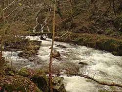 The river is formed as the Upper East Lyn at Malmsmead from two minor tributaries, the Oare Water and Badgworthy Water. It flows for several miles, past Brendon and makes confluence with Hoar Oak Water at Watersmeet, where Watersmeet House is situated.[1] The river then passes through a narrow gorge section, before flowing downstream for a further 2.5 miles (4.0 km) until the river meets with the West Lyn River and flows into the Bristol Channel at Lynmouth.[2]