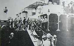 ![]() Soldiers of the East River Column disembark from United States Navy vessels in Shandong, 1945. | |