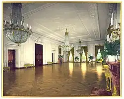 President Grover Cleveland made no changes to the East Room, although a divan upholstered in gold was added below the main chandelier. It was supplied by W. H. Houghton & Co. of Washington, D.C.[78]