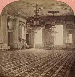 At the time of Lincoln's death in 1865, the East Room contained 24 chairs, four sofas, four tables, eight sets of drapes, eight sets of lace curtains, eight mirrors, and one carpet.[59] All the furniture was in poor shape.[60] During his administration, members of the public attending the weekly receptions in the room had heavily vandalized the room in seeking souvenirs, ripping down portions of the wallpaper and stealing cords and tassels from the drapes. Someone even cut a square yard from one of the damask drapes.[61] Others took scissors and knives to the carpet, gouging the oak floor beneath,[62] and gilded ornaments were stolen from the mantels.[60]