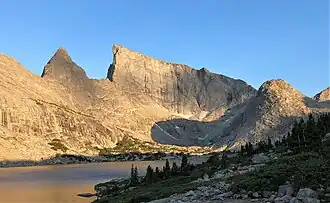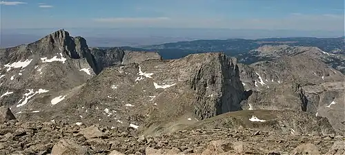 East Temple Peak (exact height range is somewhere between 12,605 to 12,645 feet (3,842 to 3,854 m)[1]) is located in the southern Wind River Range in the U.S. state of Wyoming. East Temple Peak is a little over 1 mile (1.6 km) northeast of Temple Peak and 1.5 mi (2.4 km) west of Wind River Peak.[3] A small glacier clings to the northeast slopes of East Temple Peak. East Temple Peak is in the Bridger Wilderness of Bridger-Teton National Forest.