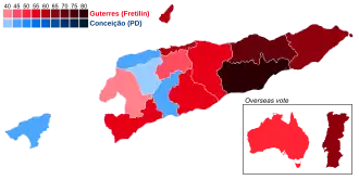 The President of East Timor is elected using the two-round system.[3] If it had been required, a second round would have been held on 20 April.[1]