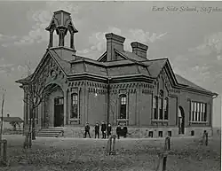 The East Ward School was a single-story brick structure consisting of two sections: the original building, constructed in 1876, and a 1906 addition.[2] The 1876 building was a rectangular structure, with a low hip roof with a gable at each end. A projecting entrance had an arced, recessed porch topped with another gable. The brickwork contained an elaborate decorative scheme with corbelled and paneled bricks. There were two rooms in the interior.