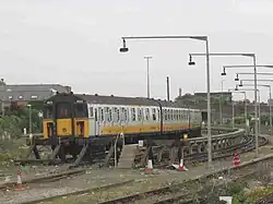 The LB&SCR opened a small engine shed in 1849, but it was demolished in 1876, being replaced by a roundhouse in the same year, which was also demolished in 1912.[6] A large, seven-road (seven-track) shed was opened in 1911, but this was badly damaged during the Second World War and was never repaired. Although the shed was closed in 1952, the site was still used as a storage area for locomotives awaiting scrapping until 1965.[7] From 1965 to 1968, diesel locomotives were stored there, before the structure was finally demolished in 1969.[8] Currently, the first engine shed site is occupied by the carriage sidings, while the later shed site is a wasteland.