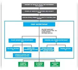 Since the 2007 decision of the Eastern Africa Council of Ministers of Defense and Security, EASF is composed of four components: EASFCOM, PLANELM, LOGBASE, and EASBRIG HQ.[7]