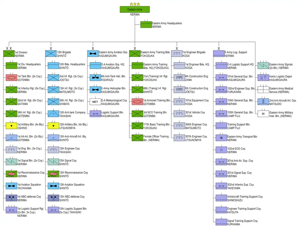 The Eastern Army (東部方面隊, Tōbu Hōmentai) is one of five active Armies of the Japan Ground Self-Defense Force headquartered at Camp Asaka in Asaka, Saitama Prefecture. Its responsibility is the defense of the Kantō and the Northern half of the Chūbu region.