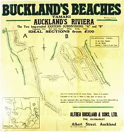 Eastern Beach and Bucklands Beach became a popular holiday destination from the 1910s.[22] The Buckland farm was first subdivided in 1916 when Bucklands Beach was established,[23] and the Devonport Steamship Company constructed a second wharf at Bucklands Beach for passenger services.[22] During this time, phoenix palms were planted at Eastern Beach, to give the area a tropical appearance.[24] In 1923, Eastern Beach was subdivided and established as a housing estate,[25] and in 1934 became a regularly used site for the Auckland Caravaning Club.[26]