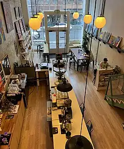 Eastern Cafe opened as one of the district's only Western-style coffee shops in 2013, in a space which previously housed a "stale and confined" office clinic.[7] The cafe was owned by I-Miun Liu, who wanted to create "a place where people can gather, study and meet for work".[3] Liu reportedly took out loans and "maxed out" credit cards[3] to open the restaurant in the "ballroom-like" space, which was vacant for approximately three years before he signed a lease. He had carpet and drywall removed, revealing original fir floors and mint green and yellow cement walls.[4]