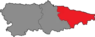 Eastern District is one of the three constituencies (Spanish: circunscripciones) represented in the General Junta of the Principality of Asturias, the regional legislature of the Principality of Asturias. The constituency currently elects five deputies. It comprises the municipalities of Amieva, Cabrales, Cabranes, Cangas de Onís, Caravia, Colunga, Llanes, Nava, Onís, Parres, Peñamellera Alta, Peñamellera Baja, Piloña, Ponga, Ribadedeva, Ribadesella and Villaviciosa. The electoral system uses the D'Hondt method and closed-list proportional representation, with a minimum threshold of three percent.