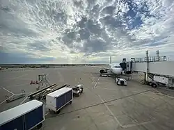 The airport was previously served almost entirely by regional jets, but now sees Delta use Airbus A320s that fly to Atlanta, as well as United with Airbus A320s and Boeing 737s to Denver International Airport and O'Hare International Airport. American has recently upgraded flights in 2022 on Airbus A319s and Airbus A320s to Charlotte, Dallas and Phoenix. Delta uses mostly regional jets to Minneapolis, although the size will increase on most flights there to 70–76 seats with first-class cabins, while Allegiant and Frontier fly Airbus A320 family aircraft. The airport sees five airlines with non-stop flights to seventeen airports. The airport has nine gates on the upper concourse with jet bridge boarding. The airport used to be divided into two concourses, designated (B) and (C). After the renovation, all the B gates were removed and three new gates were added in addition to the C gates. The gates lost their "C" designation and became gates 4–9. The new gates 1–3 serve Delta and Frontier.[5] Shortly thereafter, the airport expanded the concourse and added an additional 4 gates, making for a total of 13 gates.