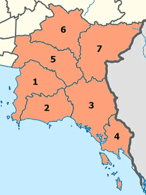 According to the six geographical regions established by the National Research Council of Thailand, the eastern region includes seven provinces.