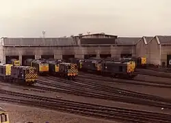 In 1987, the allocation of the depot included Classes 20, 26, 27, 37 and 47, and DMU Classes 101 and 104.[2] Meanwhile, Class 08 shunters were also stabled.[3] At that time, the depot had a wheel lathe and two snowploughs. The depot's logo is commonly noted as having been a Scottie dog,[2] however it was more closely reflective of a West Highland White Terrier.