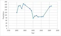 In 1880, the population density of Easton was 0.125 people per hectare, dropping to 0.0625 people per hectare in 1900 where it remained fairly constant until 1960.[12] However, by 2001, the population density had increased to 0.3 people per hectare[13] and remained the same until 2011.[14]