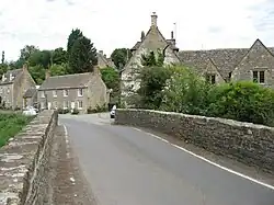 The small parish church, which has no dedication, stands above the village near the Malmesbury-Sherston road. Its 15th-century roughcast west tower is described as humble by Pevsner; the rest is a rebuilding of 1836 to designs of William James, a Gloucestershire architect.[9] In rubble stone with ashlar buttresses and stone slate roofs, the church has a nave, chancel and south porch; inside there is ribbed Gothic vaulting to the nave and chancel.[10] The 1836 work was instigated by the vicar, William S. Birch, who also oversaw the building of a village school and (around 1830) a new vicarage.[11][12] Most of the windows of the church were reworked later in the 19th century.[10]