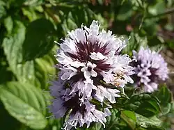 Eau de Cologne mint, also known as orange mint and bergamot mint, is a cultivated mint. In a 1970 study, most plants were found to be male sterile forms of Mentha aquatica, so were regarded as Mentha aquatica var. citrata, although in England the hybrid Mentha × piperita was found.[2] The Royal Horticultural Society treats eau de Cologne mint as Mentha × piperita f. citrata.[3] The World Checklist of Selected Plant Families sinks both scientific names into Mentha aquatica.[1]