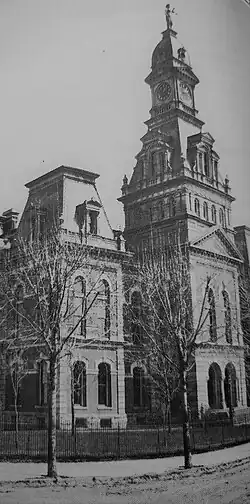 "by fire which broke out in the pool room of the Mountain House. Every building in the block from the Mountain House to the county court house was destroyed. The loss is estimated between $250,000 and $300,000. The court house was not damaged although the buildings adjoining were destroyed. Fire companies from many northern Cambria towns were summoned to assist the Ebensburg company. The Johnstown city fire department also went to the scene. The buildings destroyed include the fine building of the Cambria Savings and company, several hotels, a livery barn, a bank building and a number of small office buildings. The telephone communications were cut off. The buildings destroyed were thirteen in number. A cigarette dropped in the poolroom the night previous is believed to have started the fire."[20]