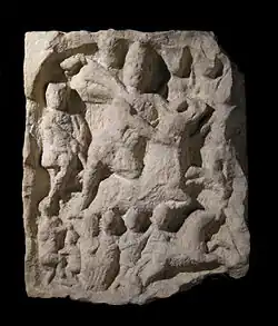 A range of evidence of Roman religious beliefs among the people of Eboracum have been found including altars to Mars, Hercules, Jupiter and Fortune. In terms of number of references, the most popular deities were the spiritual representation (genius) of Eboracum and the Mother Goddess.[28] There is also evidence of local and regional deities. Evidence showing the worship of eastern deities has also been found during excavations in York. For example, evidence of the Mithras cult, which was popular among the military, has been found including a sculpture showing Mithras slaying a bull and a dedication to Arimanius, the god of evil in the Mithraic tradition.[29] The Mithraic relief located in Micklegate[30] suggests the location of a temple to Mithras right in the heart of the Colonia.[31] Another example is the dedication of a temple to Serapis a Hellenistic-Egyptian God by the Commander of the Sixth Legion, Claudius Hieronymianus.[32] Other known deities from the city include: Tethys,[33] Veteris,[33] Venus,[34] Silvanus,[35] Toutatis, Chnoubis and the Imperial Numen.