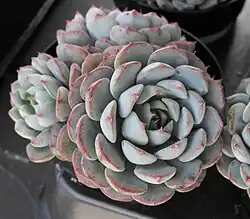 Echeveria minima, the miniature (or mini) echeveria, is a species of succulent flowering plant in the stonecrop (sedum) family, Crassulaceae, native to northeastern Mexico.[2] Among the many Echeveria species and cultivars, Echeveria minima, in particular, has rather small and diminutive, light-teal blue rosettes edged with pink leaf margins. The attractive "artichoke"-like rosettes eventually produce enough offsets that they grow into a small colony, forming a low mound. Echeveria minima readily produces yellow, bell-shaped flowers on vertical inflorescences in the spring. A highly collectible succulent, it has gained the Royal Horticultural Society's Award of Garden Merit.[3]