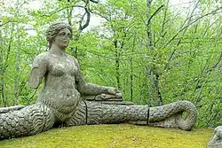 Hesiod's Echidna was half beautiful maiden and half fearsome snake. Hesiod described "the goddess fierce Echidna" as a flesh eating "monster, irresistible", who was like neither "mortal men" nor "the undying gods", but was "half a nymph with glancing eyes and fair cheeks, and half again a huge snake, great and awful, with speckled skin", who "dies not nor grows old all her days".[10] Hesiod's apparent association of the eating of raw flesh with Echidna's snake half suggests that he may have supposed that Echidna's snake half ended in a snake-head.[11] Aristophanes (late 5th century BC), who makes her a denizen of the underworld, gives Echidna a hundred heads (presumably snake heads), matching the hundred snake heads Hesiod says her mate Typhon had.[12]