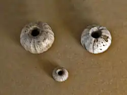 | Echinopsis from Sudan, perforated specimen to be threaded. On display at Galerie de paléontologie et d'anatomie comparée in Paris | |