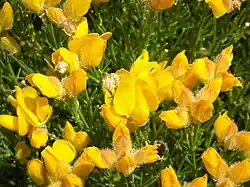 Very thorny, rounded, branched shrub, forming cushions close to the ground. Branches are opposite and grooved. Trifoliate opposite leaves, with narrowly lanceolate leaflets. The flowers are at the end of the branches, gathered in tight clusters of 3 to 9. Yellow corolla, butterfly-shaped, with a silky exterior. Flowers during the summer.[1]