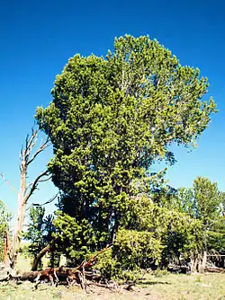 The USGS defines ten forested zones in the Rocky Mountains.[1] The more southern, warmer, drier zones are defined by the presence of pinyon pines/junipers, ponderosa pines, or oaks mixed with pines. The more northern, colder, wetter zones are defined by Douglas-firs, Cascadian species (such as western hemlock), lodgepole pines/quaking aspens, or firs mixed with spruce. Near the treeline, zones can consist of white pines (such as whitebark pine or bristlecone pine); or a mixture of white pine, fir, and spruce that appear as shrub-like krummholz. Finally, rivers and canyons are home to unique forest habitats even in the more arid parts of the mountain range.[1]