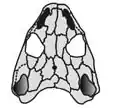 Schoch & Milner (2014) listed seven features in the diagnosis of Ecolsonia: (1) tabular and squamosal frame otic fenestra; (2) prefrontal and postfrontal separated (shared with most other trematopids); (3) preorbital region of equal length to posterior skull table; (4) vomer with a posteromedial process meeting the pterygoid (shared with other trematopids); (5) a supratemporal that is twice as long as it is wide; (6) triangular patch of denticles on the parasphenoid (shared with other trematopids); and (7) basipterygoid region unsutured (shared with some other trematopids).[4] Trematopid synapomorphies include the posterior process of the vomer, the denticles on the parasphenoid, and the supinator process of the humerus. A large number of small scales were also found with some specimens of Ecolsonia that probably covered the entire body, a feature similar to that seen in the trematopid Anconastes; these are distinct from the osteoderms of dissorophids that are only associated with the vertebral column.