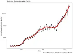 The Australian economy is dominated by its service sector, which in 2017 comprised 62.7% of the GDP and employed 78.8% of the labour force.[6] At the height of the mining boom in 2009–10, the total value-added of the mining industry was 8.4% of GDP.[37] Despite the recent decline in the mining sector, the Australian economy has remained resilient and stable[38][39] and did not experience a recession from 1991 until 2020.[40][41] Among OECD members, Australia has a highly efficient and strong social security system, which comprises roughly 25% of GDP.[4][42][3]