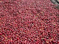 As of 2023, agriculture accounts for almost 36% of GDP, 81 percent of exports, and 73 percent of the labour force.[45] Many other economic activities depend on agriculture, including marketing, processing, and export of agricultural products. Production is overwhelmingly of a subsistence nature, and a large part of commodity exports are provided by the small agricultural cash-crop sector. Principal crops include coffee, pulses (e.g., beans), oilseeds, cereals, potatoes, sugarcane, and vegetables. Exports are almost entirely agricultural commodities, with coffee as the largest foreign exchange earner, and its flower industry becoming a new source of revenue: for 2005/2006 (the latest year available) Ethiopia's coffee exports represented 0.9% of the world exports, and oilseeds and flowers each representing 0.5%.[46] Ethiopia is Africa's second biggest maize producer.[47] In 2000, Ethiopia's livestock contributed to 19% of total GDP.[48]