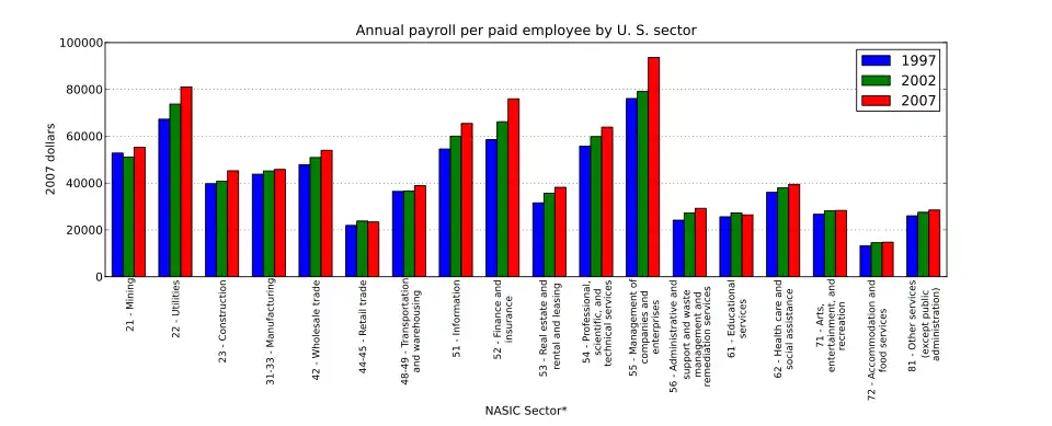 The Census Bureau releases sector-by-sector statistics on the number of establishments, total business activity, annual payroll, and number of paid employees. A standardized classification of the economy into sectors makes it possible to compare census results over time. However, to reflect the evolving nature of the economy, the NAICS is updated every five years. Therefore, when comparing different censuses, a particular NAICS basis is usually specified. The following data are based on a comparison of the 2007 and 2002 censuses using the 2002 NAICS basis and an older comparison of the 1997 and 2002 censuses using the older 1997 NAICS basis. Thus, (*) the 1997 data are based on a slightly different classification than the 2007 and 2002 data.