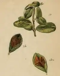 Sprig of Vaccinium vitis-idaea, with a leaf showing a flat mine (1b); upperside of a leaf, with an inflated mine (1b*), and underside of the same leaf (1b**)