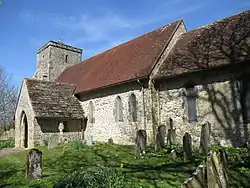 The Anglican parish church dedicated to St. Andrew was rebuilt in the late twelfth century, in late Norman and Early English style, beginning with the nave and finishing with the tower. The interior stone came from Caen in Normandy. The well-proportioned tower is mainly of flint.[7] There is an unusual lead font with a raisable conical wooden cover. A round stone sink with Anglo-Saxon carving, which was found in the churchyard, is believed to be the piscina of the original Anglo-Saxon church. There are three mass-clocks or sundials carved into the stone on the south side of the church. These originally had a projecting metal rod called a gnomon or style to cast a shadow, and were used to divide up the day before clocks existed. A fourth mass-clock on the north side of the church sees no sunshine and is upside down, showing that the stone was reused from the earlier church, which was built c. 940. On either side of the altar are two confession windows used by Franciscan friars to hear confessions when they were forbidden to hear confessions in church and people knelt outside the windows. The pulpit and altar rails were given by Archbishop Laud. Stained glass windows are by James Powell and Sons and the East window was made by the Royal Bavarian Stained Glass Manufactory, Munich.[7]