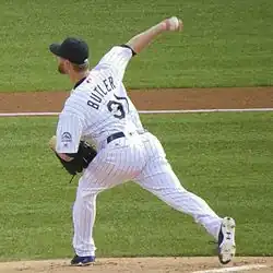 The Rockies invited Butler to spring training in 2014.[12] They assigned him to Tulsa to start the 2014 season,[13] and he started Tulsa's season opener.[14] After he pitched to a 2.49 ERA with 40 strikeouts and 19 walks in 68+2⁄3 innings pitched, the Rockies promoted Butler to the major leagues for his debut on June 6.[15] He recorded a loss in his first start, pitching 51⁄3innings and giving up 6 runs on 10 hits.[16] He was placed on the disabled-list before his next scheduled start with right shoulder inflammation, and he was replaced by Tyler Matzek, who would be the third starting pitcher to debut for the Rockies in six days, along with Butler and Christian Bergman.[17]