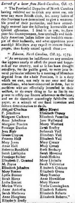 - ^ The signers of the declaration include Abagail Charlton, Mary Blount, F. Johnstone, Elizabeth Creacy, Margaret Cathcart, Elizabeth Patterson, Anne Johnstone, Jane Wellwood, Margaret Pearson, Mary Woolard, Penelope Dawson, Sarah Beasley, Jean Blair, Susannah Vail, Grace Clayton, Elizabeth Vail, Frances Hall, Mary Jones, Mary Creacy, Anne Hall, Rebecca Bondfield, Ruth Benbury, Sarah Littlejohn, Sarah Howcott, Penelope Barker, Sarah Hoskins, Elizabeth P. Ormond, Mary Littledle, M. Payne, Sarah Valentine, Elizabeth Johnston, Elizabeth Crickett, Mary Bonner, Elizabeth Green, Lydia Bonner, Mary Ramsay, Sarah Howe, Anne Horniblow, Lydia Bennet, Mary Hunter, Marion Wells, Tresia Cunningham, Anne Anderson, Elizabeth Roberts, Sarah Mathews, Anne Haughton, and Elizabeth Beasly.[18]