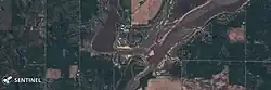 The Tittabawassee River crested at 35.05 feet (10.68 m) during the night of 20 May, inundating eastern Midland and severely damaging the village of Sanford.[36][37][38] Satellite imagery released two days later showed a new river channel carved around the failed spillway.[39] Although floodwater surrounded parts of the Dow Chemical complex in Midland, the company reported no serious damage to critical infrastructure.[40] No fatalities or serious injuries were recorded.[41]