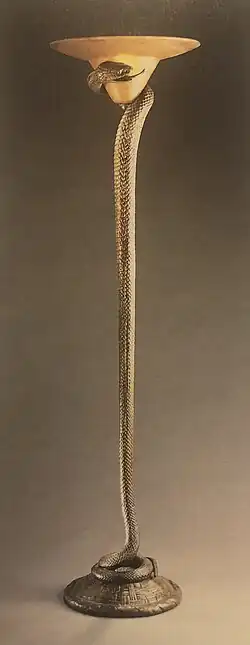 As a result of Brandt's Escalier Mollien commission, Brandt's influence among the publicity and the decorative-arts community increased. In turn, he began to expand his presence and started to collaborate with architects, the Daum Frères glassworks, and the suppliers of marble and alabaster. Brandt did a number of works with Daum, specifically when designing lamps and chandeliers. Two lamps in particular Brandt designed with Daum are the La Tentation and the Cobra lamps. Both lamps depict snakes rising from their bases and cradling an alabaster Daum glass shade. Favier began working with Brandt in 1919 when Brandt sought him out to create a new set of buildings to house the Brandt company. From that time on, Favier headed Brandt's design staff up until he resigned in 1927. Favier worked on a number of works with Brandt including Brandt's work in the 1925 Exposition.[14]