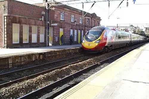 Edge Hill lies on both routes of the Liverpool to Manchester Line from Liverpool Lime Street. On Mondays to Saturdays, there is an hourly service on the northern branch to Manchester Airport via Manchester Piccadilly and an hourly service on the southern branch to Manchester Oxford Road via Warrington Central, and a half-hourly service to Wigan North Western via St Helens Central, with 4 trains per hour westbound to Liverpool Lime Street.[20] There is no Sunday service.