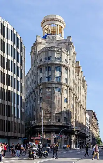 The building is roughly triangular, with two main façades and a semicircular chamfer at the corner where they meet, between Via Laietana and Carrer Argenteria in Barcelona. The building is articulated by the vertical lines of the doors and windows, interrupted discontinuously by the horizontals of the balconies. The most characteristic visual feature is the large circular structure in the style of a classical temple, atop the building at its apex. The building falls within the functionalist style that began to prevail at the time for administrative buildings.[1] Building has 42 m (138 ft) height and has 11 floors. Architectural style: neoclassicism, architect: Josep Domènech Mansana (es).[2]
