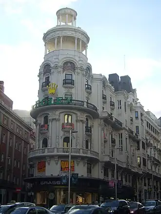 Situated just off Calle de Alcalá, at the very beginning of Gran Vía, the Edificio Grassy was built between 1916 and 1917.[1] It was constructed on a triangular piece of land, in the same way as the Edificio Metrópolis next to it. Moreover, its architect Eladio Laredo aimed to achieve an architectural similarity between both of them. This trend was respected to a certain extent along Gran Vía.