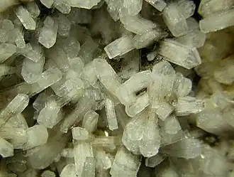 Edingtonite is a white, gray, brown, colorless, pink or yellow zeolite mineral. Its chemical formula is BaAl2Si3O10·4H2O. It has varieties with tetragonal, orthorhombic or triclinic crystals.[5]