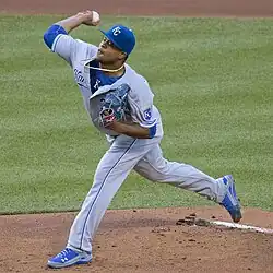 On December 29, 2014, the Kansas City Royals announced that they had signed Vólquez to a 2-year, $20 million contract.[21] During a game against the Chicago White Sox on April 23, 2015, Vólquez was ejected for his role in the brawl.[22] Two days later, he was suspended five games.[23] He had the option to appeal the suspension but dropped it on April 27, 2015, which made the suspension apply effective immediately.[24] After finishing the regular season 13–9 with a 3.55 ERA in a career-high 200+1⁄3 innings, Vólquez started Game 1 of the 2015 World Series, giving up three runs in six innings and receiving a no-decision. The Royals would go on to win, 5–4, in 14 innings. Vólquez pitched the game unaware that his father had died (his wife found out before the game and instructed the coaching staff and the press not to let Vólquez know of that until he was done pitching for the night).[25] Vólquez got the nod to start in Game 5 against Matt Harvey, where he gave up 2 earned runs on only 2 hits in 6 innings with a no-decision. The Royals again forced the game into extra innings before defeating the Mets to win the World Series.