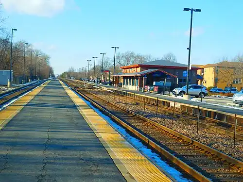Edison Park station in January 2016. The new depot is visible on the right. | ||||||||||||||||||||||||||||||||||||||||||||||||||||||||||||||||||||||