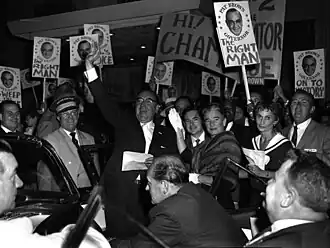 Brown's first term as governor was very successful, but failings on important matters to him were costly. Agriculture and special interests defeated his best efforts to pass a $1.25 per hour minimum wage, and Brown's opposition to capital punishment was overruled by the practice being supported statewide. Brown was a supporter of Senator John F. Kennedy in the 1960 presidential election, but Brown's California delegation to the Democratic National Convention did not abide by his support for Kennedy, which nearly cost Kennedy the nomination. Brown's opponent in 1962 was former Vice President Richard Nixon. Having narrowly lost the presidency to Kennedy in 1960, Nixon was not interested in the governorship of his native California other than as a path to the White House.[8] Unfamiliar with California politics and matters, Nixon resorted to accusing Brown of 'softness' against communism, which was not a successful platform. In the November 1962 election, Brown was reelected, by 296,758 votes, whereupon Nixon famously held his self-proclaimed "last press conference" (he would eventually become president in 1969).