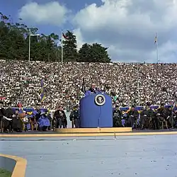 Californians were energized by the need to catch up with the Soviet Union, which had taken the lead in technology by launching the world's first space satellite Sputnik 1. Brown signed the California Master Plan for Higher Education in 1960.[21] This new system defined the roles of the University of California, the California State University, and California Community College systems, each with different goals, objectives, offerings, and student composition.[22] It provided a model for other states to develop their own similar systems. Governor Brown sought free higher education for California students, which the Master Plan provided. His successor, Ronald Reagan, would change this policy, insisting on student tuition.[23] With the passage of Proposition 13 in 1978, state education funding fell further, straining Brown's Master Plan due to lack of property tax funds.[24]