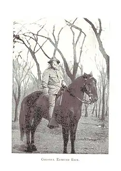 In July 1898, Colonel Rice was appointed by President William McKinley to be the senior colonel of all U.S. Volunteers in the Philippines. He commanded the 26th Infantry Regiment, a New England regiment, that was involved in skirmishes against the insurgents and Moros. In 1899, he was appointed as Military Governor of the Island of Panay.[4] In that capacity following recommendations of the First Philippine Commission, he established public schools, took the census, and administered the oath of allegiance to over 60,000 Filipinos.[1] He served until Filipino General Martin Delgado was appointed first Civil Governor of Panay on April 11, 1901.[5]