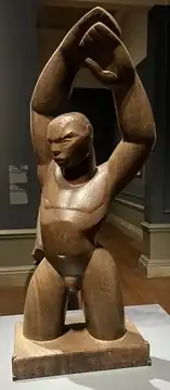 This voluptuousness can also be seen in her work entitled Eve Archived 7 May 2019 at the Wayback Machine (1929), which derived from the story of the first woman mentioned in the bible. The overall dimension of the work is 2006.6 x 508mm, and was carved from a single piece of mahogany wood.[9] The nude Eve is seen standing on a circular platform with her head facing behind her. The figure has one hand whose fingers are rolled into a fist to cover her pubis; similar to the arm gestures are a combination of the "Venus Pudica". The other hand is bent at the elbow and covers a breast while the back of the hand awkwardly rests on the shoulder with fingers curled inwards. In this pose of the arm we see the influence of Picasso's Two Nudes. The sculpture is seemingly filled with tension, as suggested by the clenching of the fists, the abnormal twist of the body and the awkward attempt to obscure a breast.[10] The body gives a sense of youthfulness and its long hair flowing downwards onto the chest matches the curvy rhythm of her body. Wayne Brown has described the sculpture as "woman startled to look over her shoulder" an "image of nakedness surprised" yet, Manley seemed had removed all traces of expression from the face of the sculpture of her re-interpretation of Eve and instead focused the expressions into the pose of the figure. Her idea of this sculpture was to draw reference to the expulsion of Eve out of the Garden of Eden. The face looking backwards is also said to represent Eve looking back at the garden after her expulsion.[11]