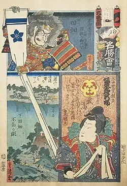 An entertaining feature of the Edo-no-Hana Meisho-e prints is the use of double meanings, which often relate to place names, within the text that accompanies many of the famous landscape scenes.[6] It is also notable that puns and dual interpretations can be found in some of the signed alternate names used by the artists and within the title of the series itself. The phrase, "Flowers of Edo" was not only a metaphor for the finest aspects of the day, but also a colloquial expression used to describe the fires that often threatened an urban Edo environment, constructed predominantly of wood and paper.[7] The reference to the constant threat of flames in the city is also reinforced in each of the prints, by the display of the troop name, number and emblem of the firemen responsible for protecting the relevant Edo district pictured.[6] Moreover, as fire-fighters were admired as great examples of enthusiasm and bravery, they were likely considered as much a "Flower of Edo" as any popular Kabuki actor or fashionable Ukiyo-e print artist of the period.